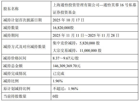 2025年11月28日,公司收到股东通怡芙蓉16号发来的《减持结果告知函》。上海通怡投资管理有限公司—通怡芙蓉16号私募证券投资基金(以下简称“通怡芙蓉16号”)于2025年11月11日至2025年11月28日期间通过集中竞价方式减持公司股份5,820,000股,通过大宗交易方式减持公司股份11,000,000股,合计减持公司股份16,820,000股,占公司总股本的比例为1.96%,本次减持计划已实施完毕。