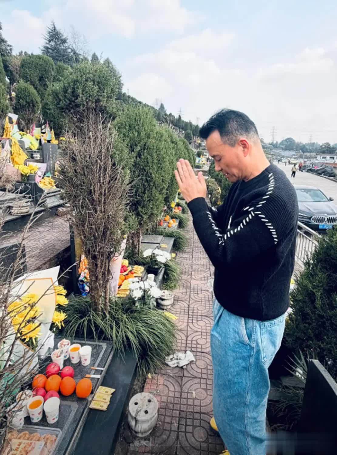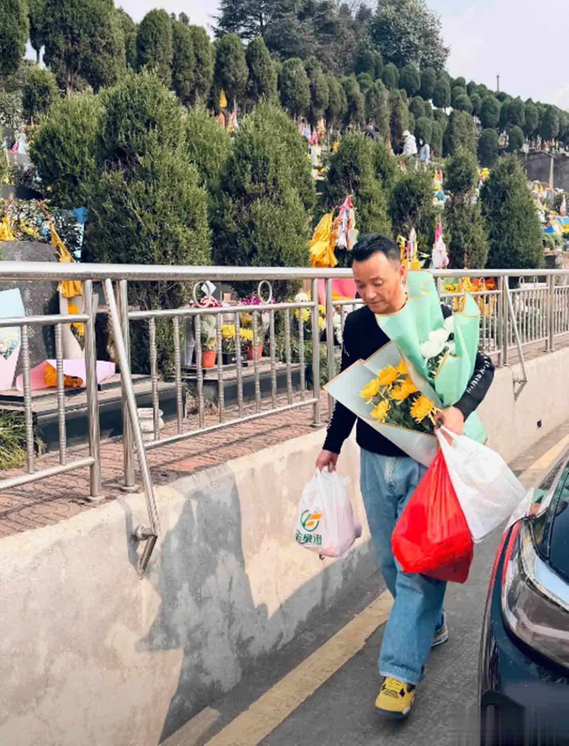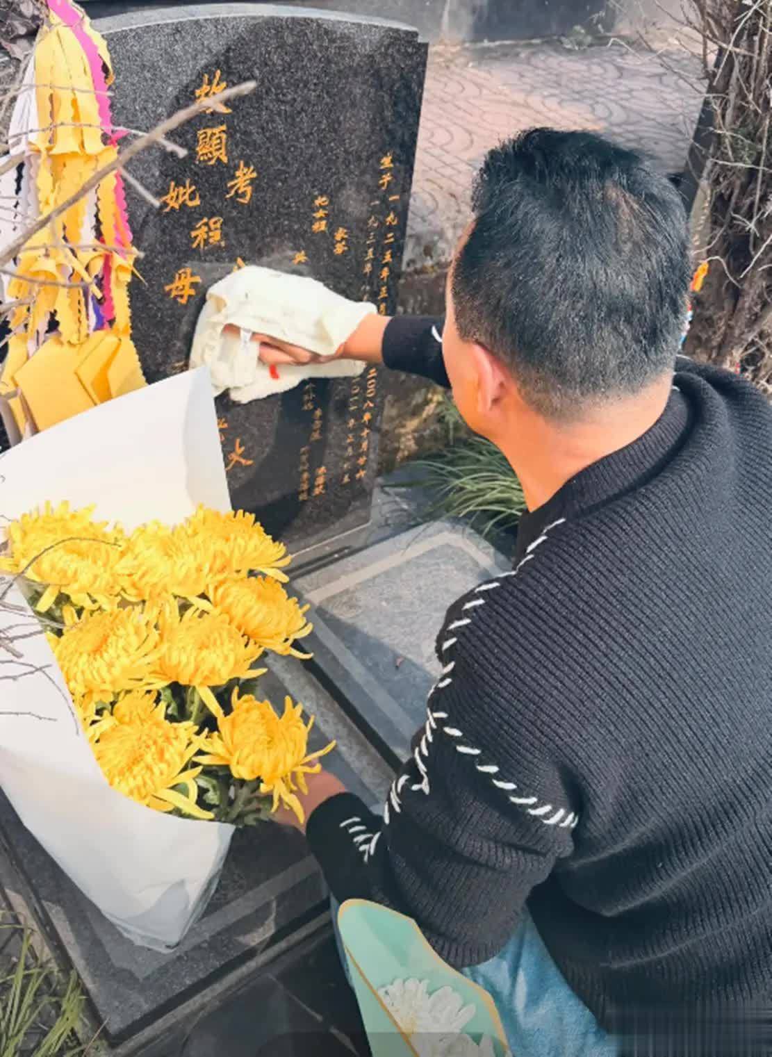 照片中,程江身穿黑色长袖上衣搭配浅蓝色牛仔裤,休闲装扮显得年轻有活力。留着一头黑发的他,看不出已是59岁高龄。祭祖时,程江双手提着装满祭品的袋子,怀抱一束用浅绿色纸包裹的黄色菊花,神情略显沉思,整体气质沉稳内敛。